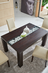 Mesa con extensión telescopica con detalle de cristal con piedras blancas . El juego de comedor diferente ,elegante ,practico de cuatro sillas que andabas buscando para tu espacio interior .Sillas totalemnte forradas en tela .